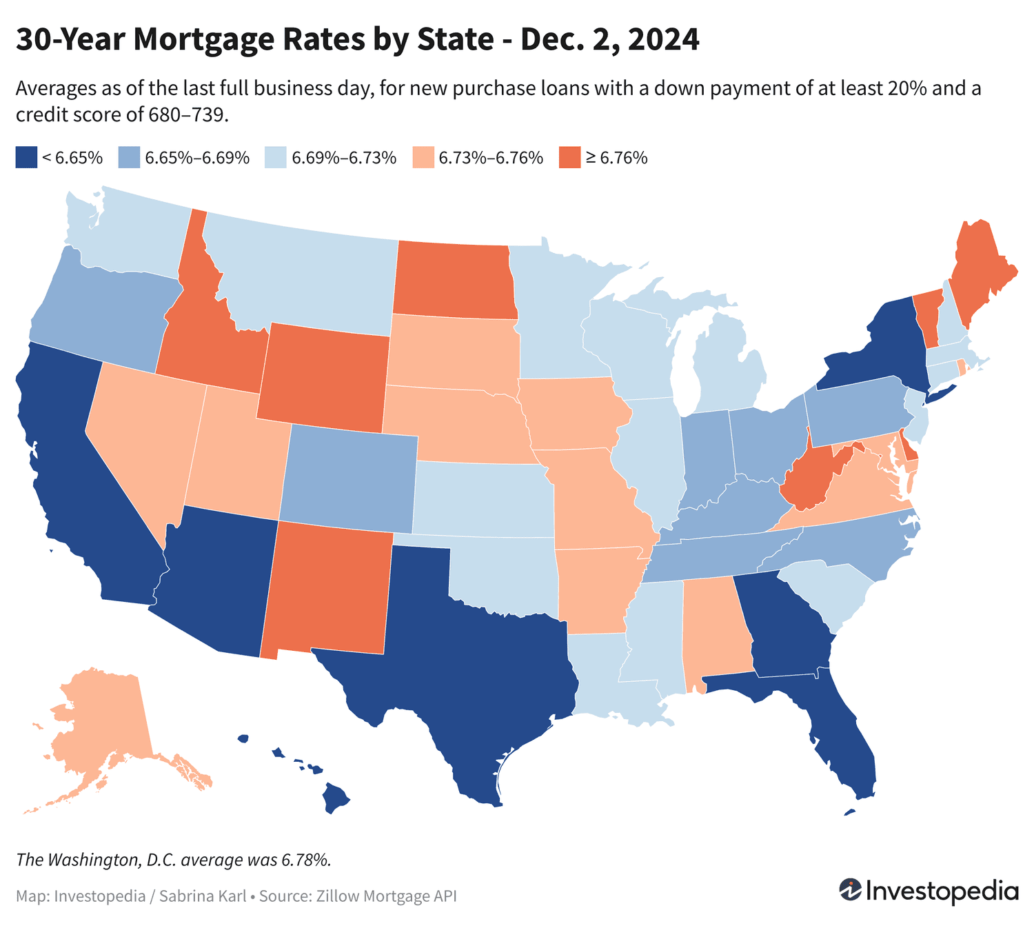 Vendredi, les États offrant les taux hypothécaires neufs sur 30 ans les moins chers étaient New York, la Californie, la Floride, la Géorgie, l’Arizona, Hawaï et le Texas. Sept États ont enregistré des moyennes comprises entre 6,36 % et 6,64 %.