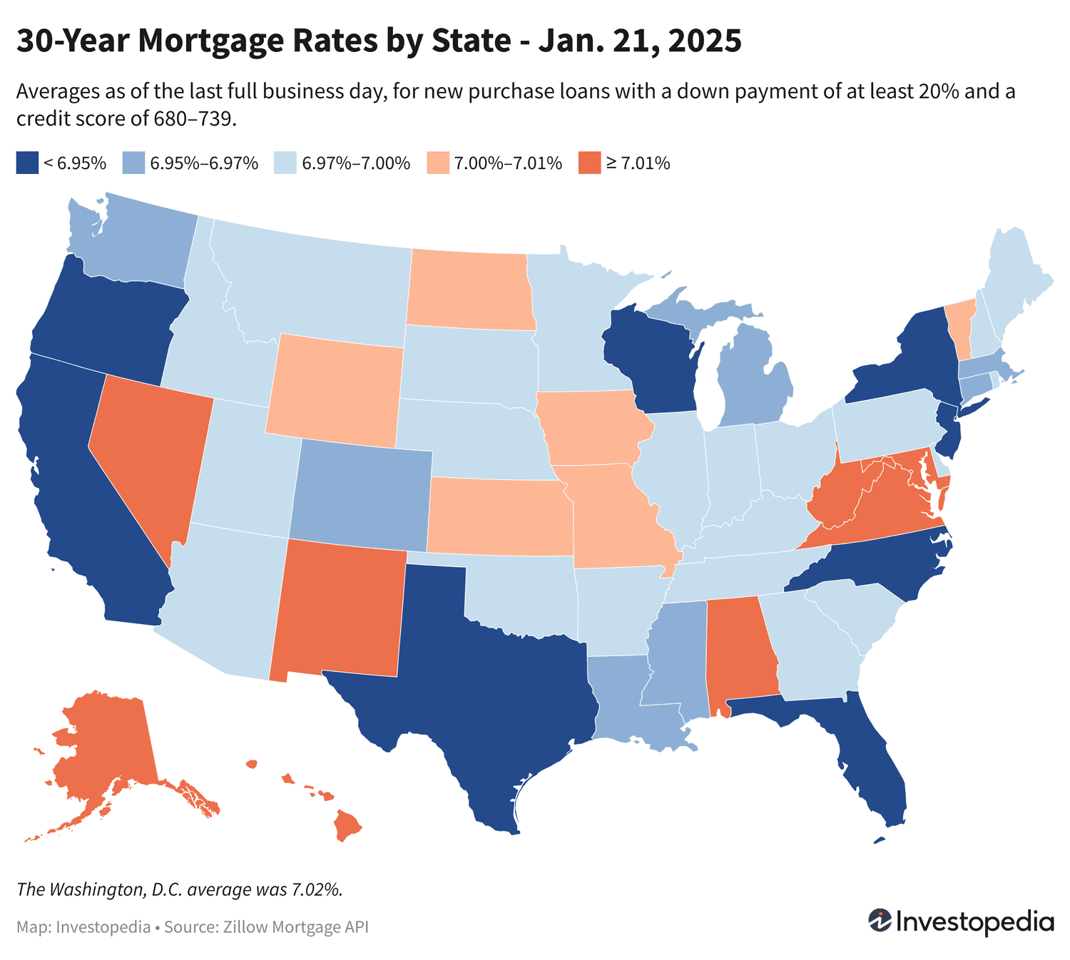 Vendredi, les États offrant les taux hypothécaires neufs sur 30 ans les moins chers étaient New York, la Californie, la Floride, l’Oregon, le New Jersey, la Caroline du Nord, le Texas et le Wisconsin. Huit États ont enregistré des moyennes allant de 6,70 % à 6,94 %.