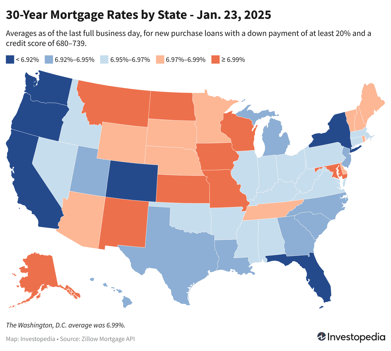 Mercredi, les États offrant les taux hypothécaires neufs sur 30 ans les moins chers étaient New York, la Californie, la Floride, l’Oregon, le Colorado et Washington. Six États ont enregistré des moyennes allant de 6,72 % à 6,91 %.