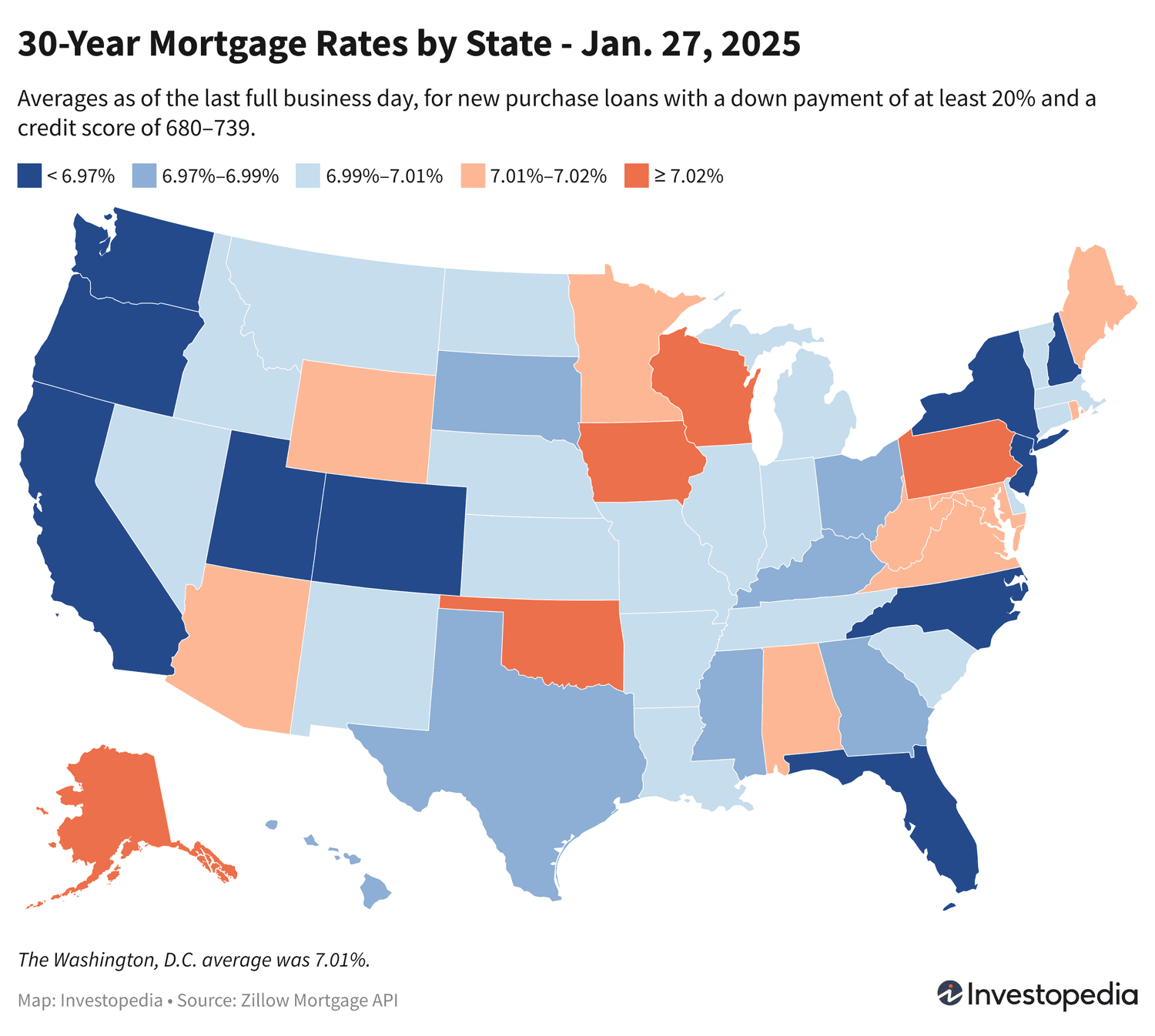 Pendant ce temps, les États avec les scores moyens les plus élevés vendredi étaient l’Alaska, le Wisconsin, l’Iowa, l’Oklahoma et la Pennsylvanie, suivis par de nombreux grands États, dont l’Arizona, le Maryland et la Virginie. La fourchette moyenne sur 30 ans pour ces États est de 7,01 % à 7,04 %.