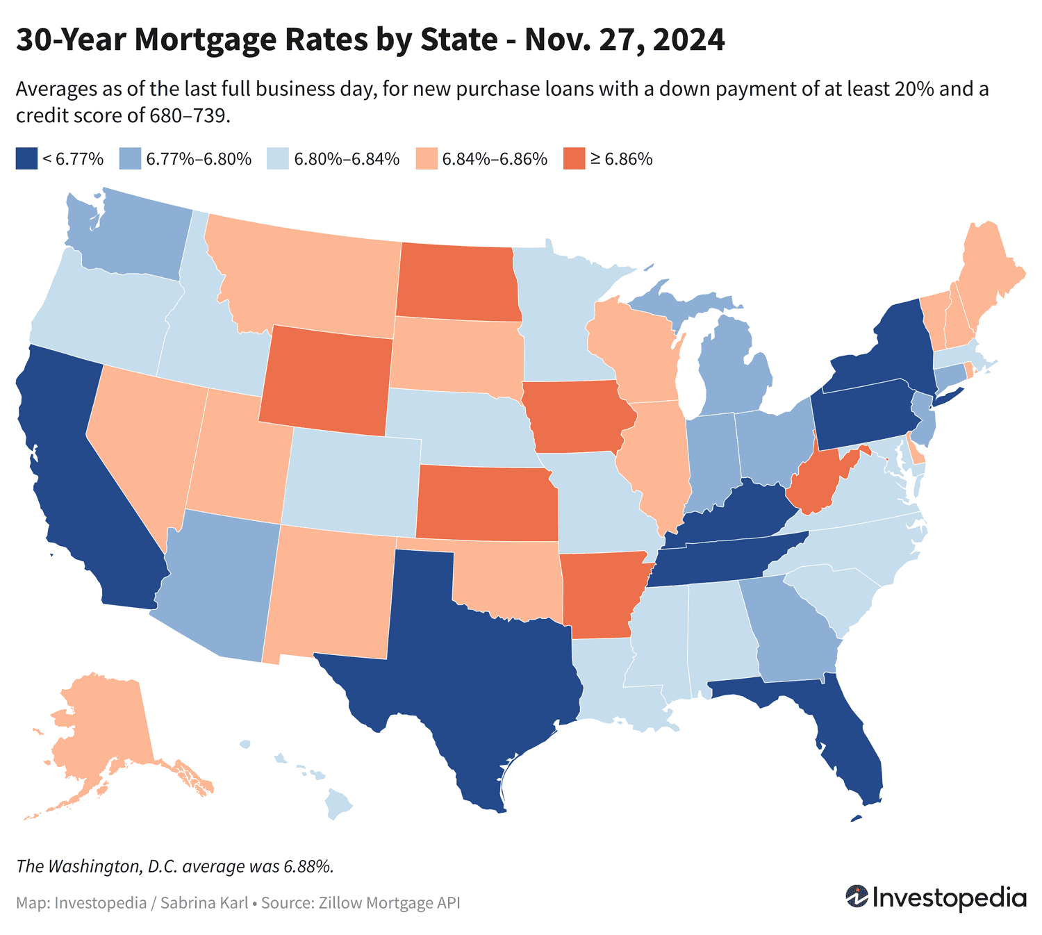 Les États offrant les taux hypothécaires neufs sur 30 ans les moins chers mardi étaient New York, la Californie, la Floride, la Pennsylvanie, le Texas, le Kentucky et le Tennessee. Sept États ont enregistré des moyennes allant de 6,52 % à 6,76 %.