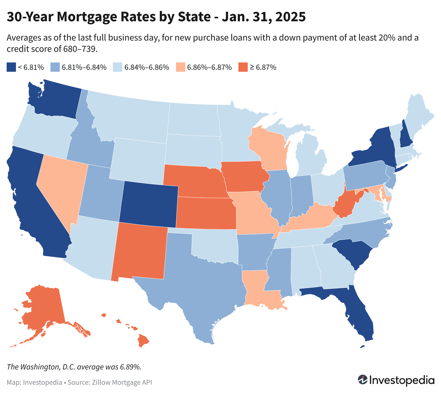 Les États offrant les taux hypothécaires neufs sur 30 ans les moins chers jeudi étaient New York, la Floride, le Colorado, Washington, la Californie, le New Hampshire et la Caroline du Sud. Sept États ont enregistré des moyennes comprises entre 6,71 % et 6,80 %.