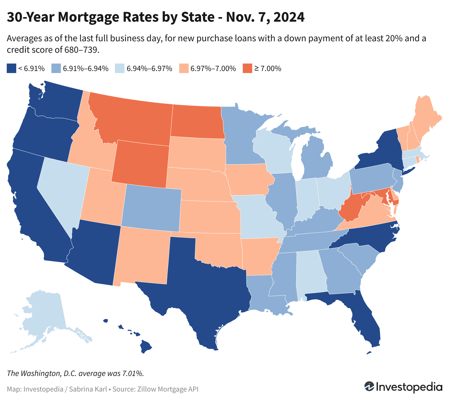 Pendant ce temps, les États avec les moyennes les plus élevées mercredi étaient le Maryland, Washington, DC, la Virginie occidentale, le Wyoming, le Montana et le Dakota du Nord. La fourchette moyenne sur 30 ans pour ces États est de 7,00 % à 7,02 %.