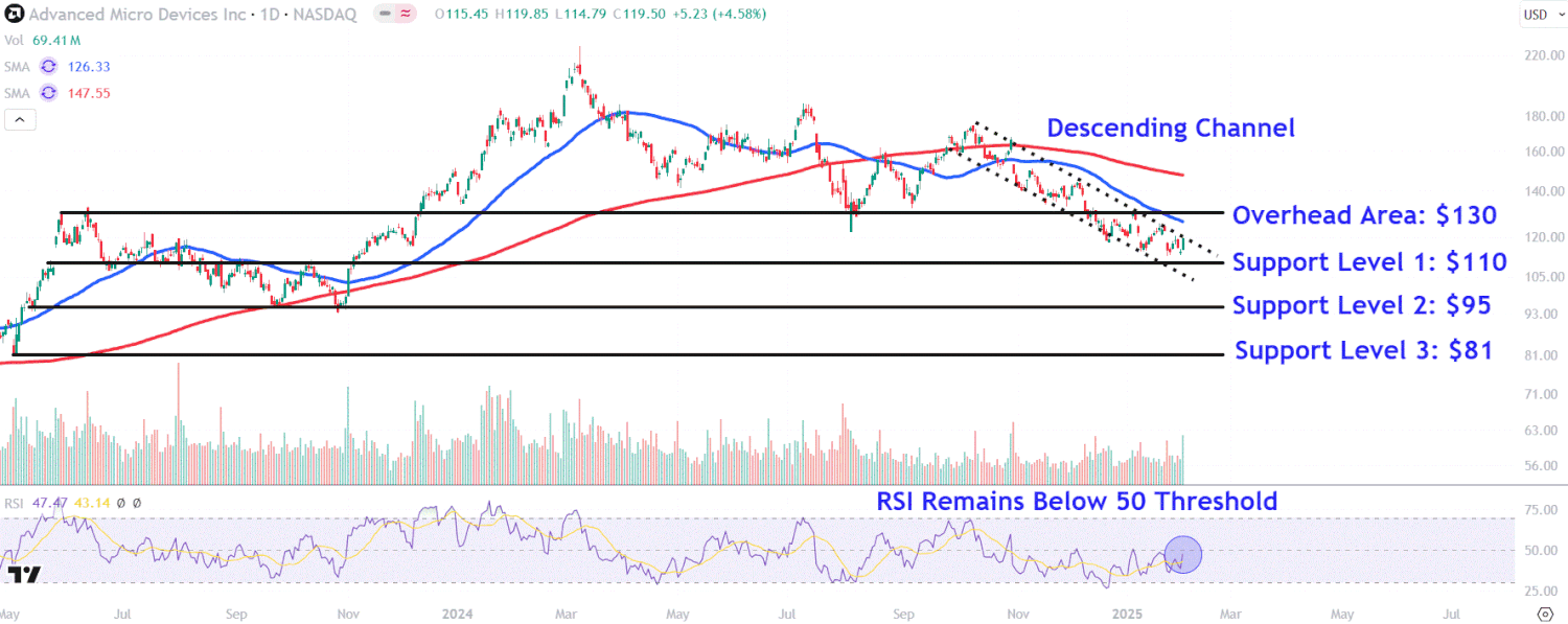 - Les investisseurs devraient surveiller les niveaux de support clés sur le graphique d’AMD autour de 110 $, 95 $ et 81 $, tout en gardant un œil sur la zone clé proche de 130 $.