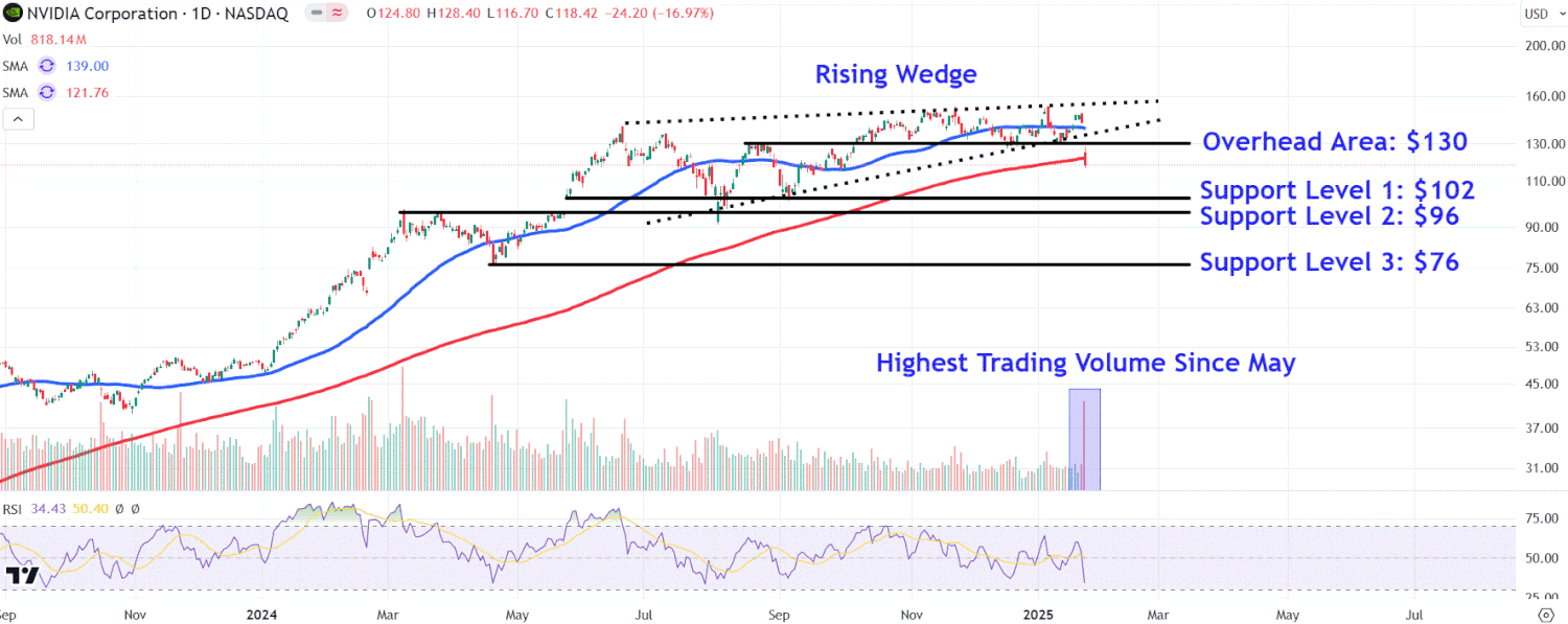 - Les investisseurs devraient surveiller les niveaux de support clés sur le graphique de Nvidia autour de 102 $, 96 $ et 76 $, tout en gardant un œil sur la zone clé proche de 130 $.