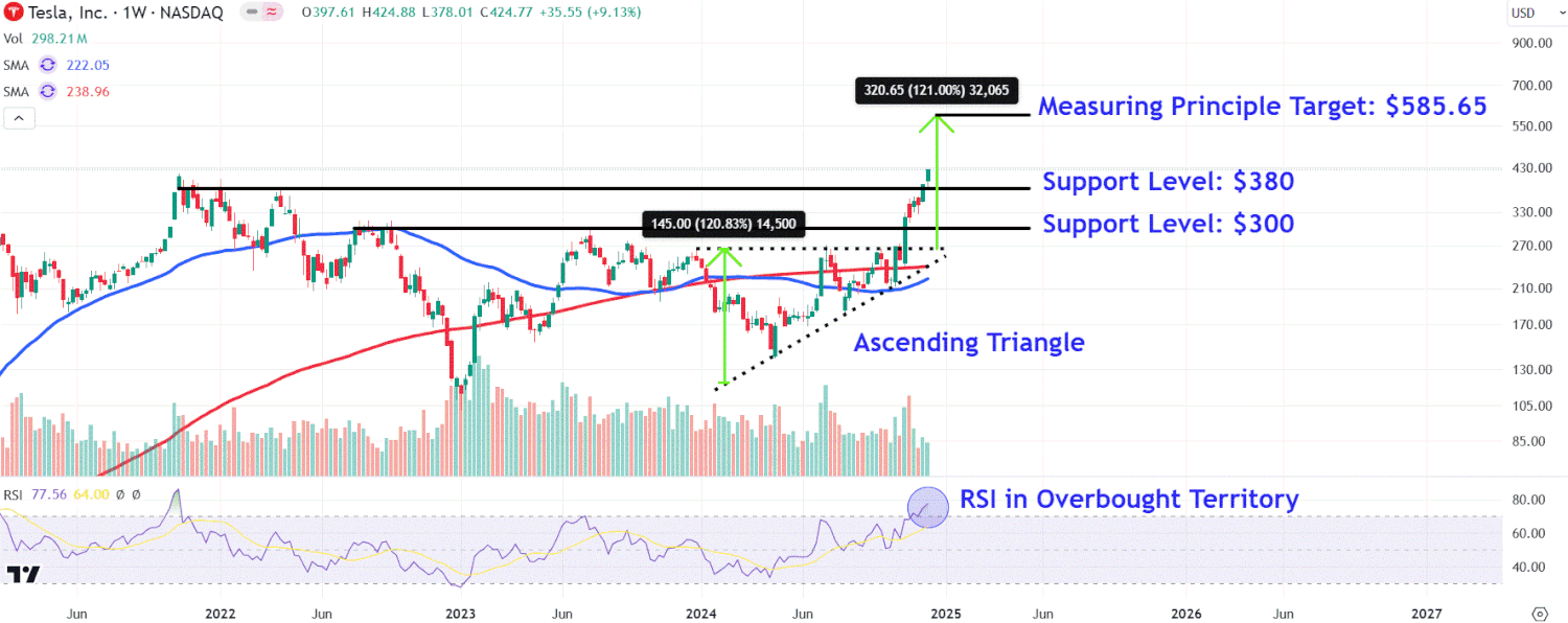Depuis la sortie d’un triangle ascendant au début du mois dernier après l’élection présidentielle, l’action Tesla a continué de fortement augmenter.