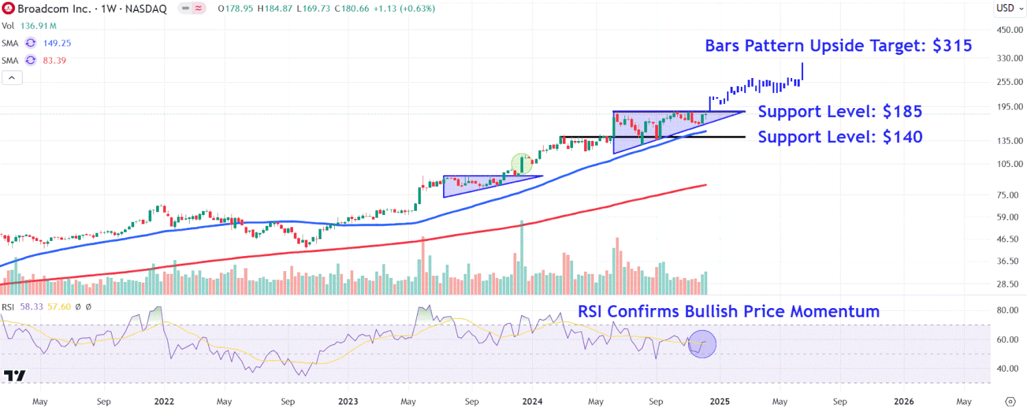 En appliquant cet outil au graphique de Broadcom, nous extrayons la tendance haussière du titre de décembre 2023 à juin de cette année et le repositionnons à l’écart de la ligne de tendance supérieure du triangle ascendant. Cela prédit un objectif de hausse des prix à long terme d’environ 315 $.