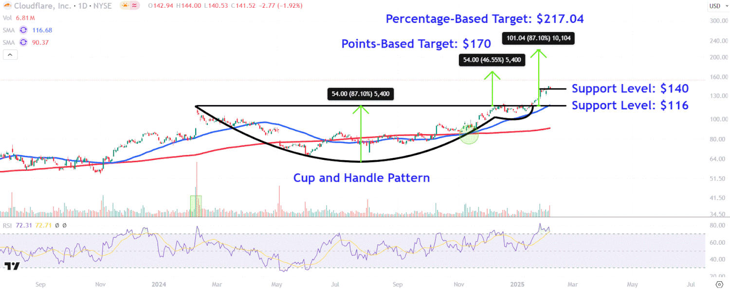Lorsque nous appliquons la technique à la prévision de cibles basées sur des points, nous calculons la distance entre la tasse et la poignée en points et ajoutons cette quantité à la ligne de tendance supérieure du modèle. Par exemple, nous ajoutons 54 $ à 116 $, projetant un objectif à 170 $, soit 20 % au-dessus de la clôture de jeudi.
