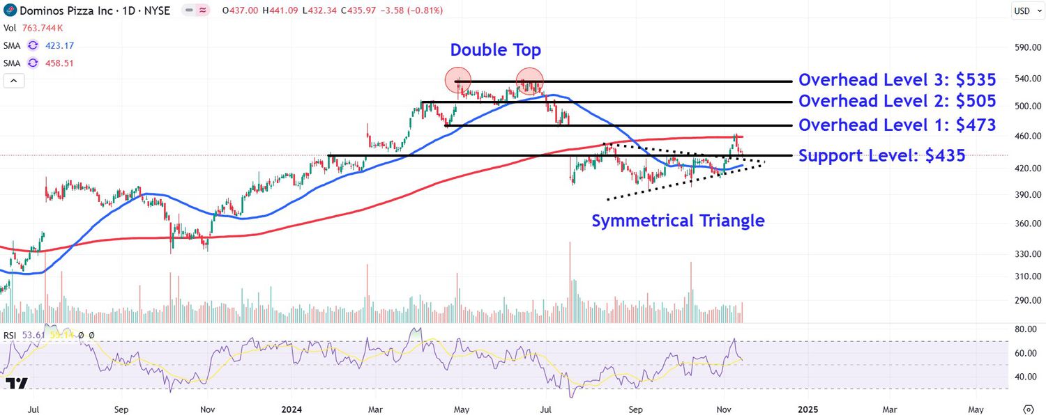 L’action Domino’s Pizza a dépassé un triangle symétrique au début du mois avant de rencontrer une pression de vente proche de la moyenne mobile de 200 jours et de reculer vers la ligne de tendance supérieure de la tendance.
