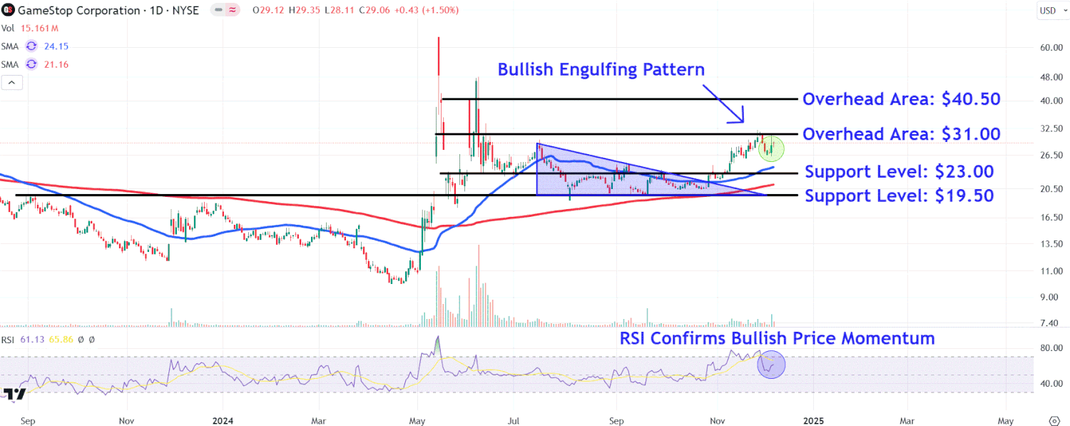 Ci-dessous, nous décomposons les indicateurs techniques sur le graphique de GameStop et identifions certains niveaux de prix clés à surveiller à mesure que les résultats trimestriels du vendeur de jeux vidéo apparaissent.